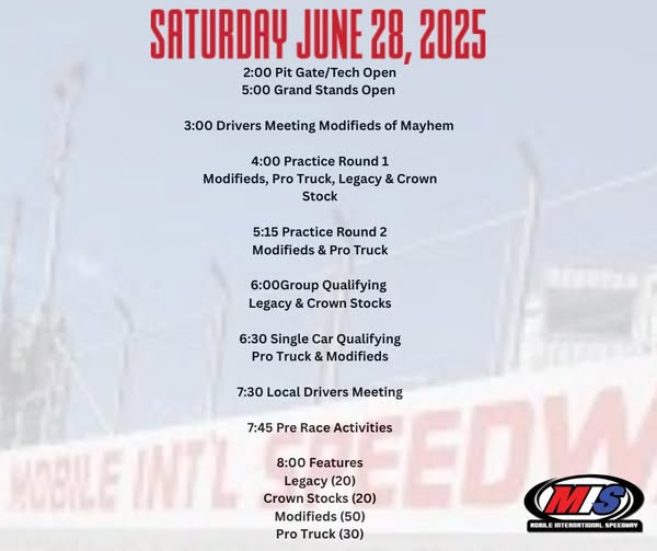 June 23, 2025: Montgomery, Alabama: The Modifieds of Mayhem Tour heads to the Gulf Coast for our rescheduled double Header and an exciting weekend of Racing. Theodore Recycling has sweetened the pot for one racer by putting up $500 for the Best average finish in the Modifeds of Mayhem tour double header June 27, 2025 and June 28, 2025.
