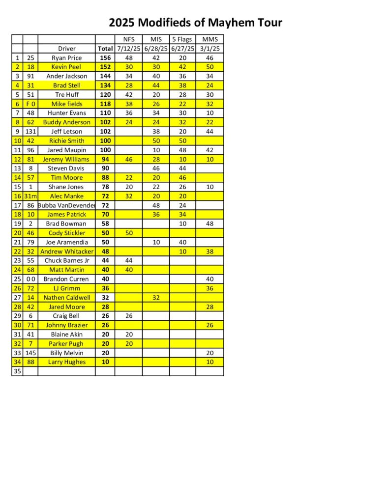 July 25, 2025 Montgomery Alabama: With 4 Races in the Books Ryan Price #7 leads the 2025 Points by 4. The Alabama driver has climbed into this position with hard racing and consistent finishes. Chipley Florida’s Kevin Peel #18 fell to second place only 4 points down after a frustrating run at Nashville Fairgrounds Speedway.