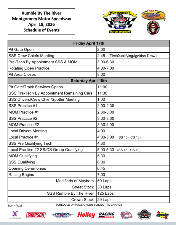 Posted inUncategorized “Rumble by the RIVER” Schedule April 18, 2026 Posted by By Landon Adams April 8, 2026 Share this:FacebookX Landon Adams View All Posts Post navigation Previous Post How Rogers-Dabbs Performance Parts is Strengthening Contributions to Short Track RacingNext PostKaden Honeycutt Goes Back-to-Back in Modifieds of Mayhem Competition at Montgomery